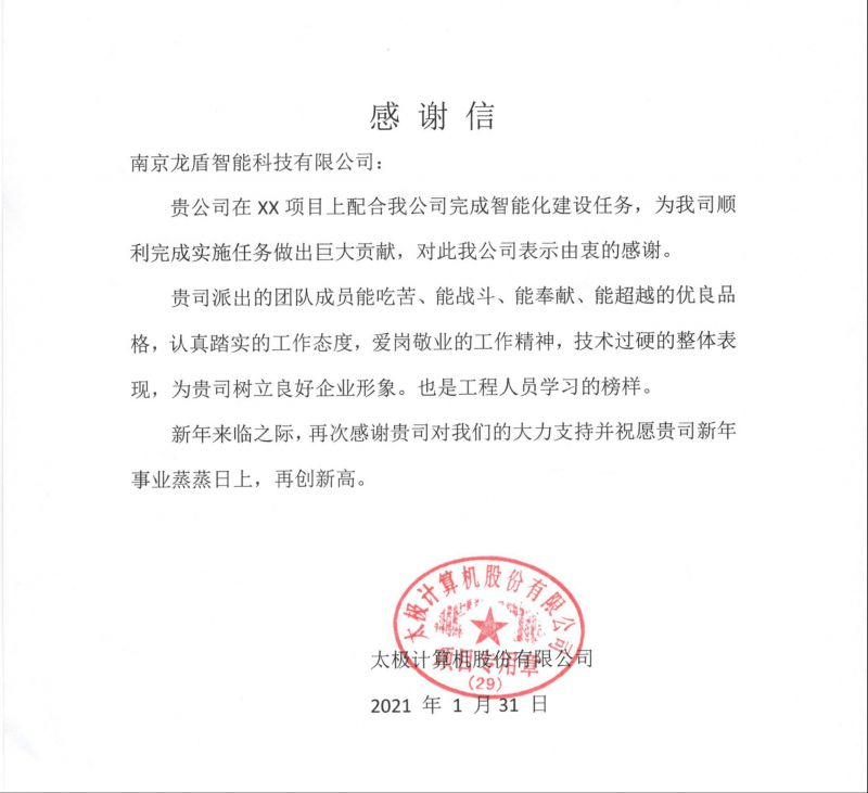 2021年1月31日我司收到來(lái)自太極計(jì)算機(jī)股份有限公司的一封感謝信。信中對(duì)我司在XX項(xiàng)目中的工作給予了充分的肯定,并致以由衷的感謝。