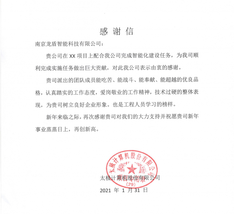 2021年1月31日我司收到來自太極計算機股份有限公司的一封感謝信。信中對我司在XX項目中的工作給予了充分的肯定,并致以由衷的感謝。